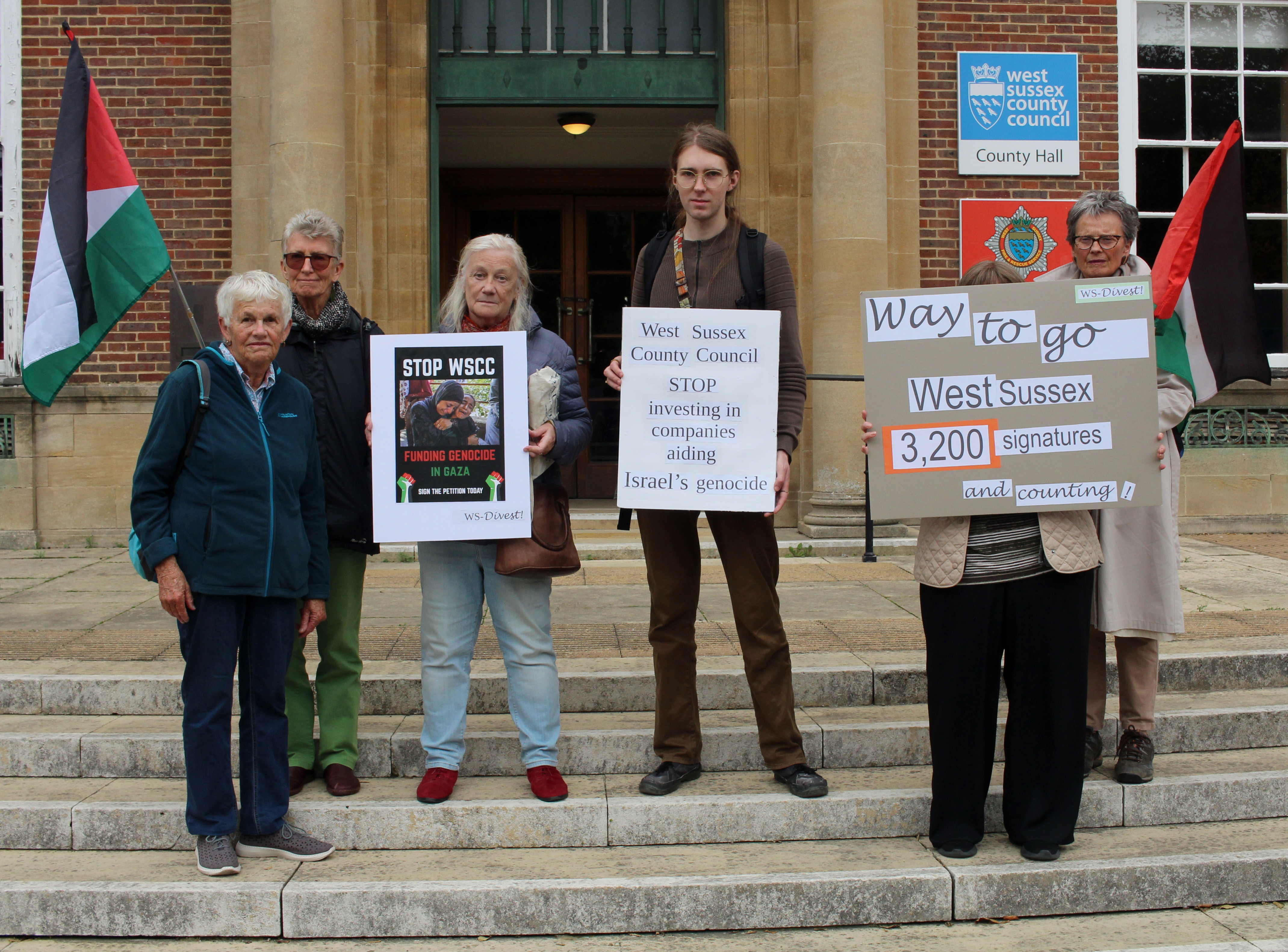 “More than 3,000 West Sussex residents have now signed our petition calling for divestment,” said Gill Poole, convenor of WS – Divest!. “That’s thousands of people who don’t want their pensions, or public money, tied up in companies enabling human rights abuses. We call on the council to immediately divest from the companies implicated in profiting from violations of international law.”